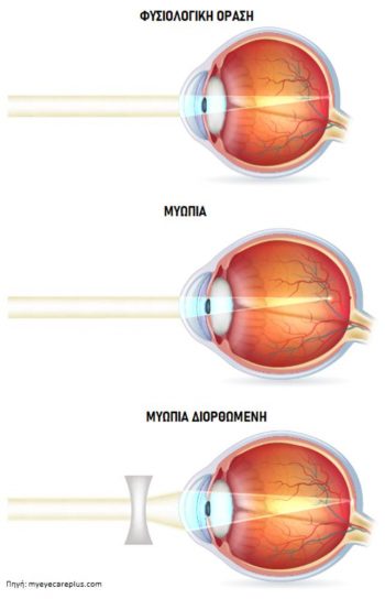 In a myopic eye, light rays are focused Front from the retina instead of on it. This is usually due to an increased anterior-posterior axis of the eye (the eye is “longer” than normal) or excessive curvature of the cornea.